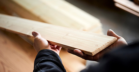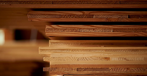 ライナウッドは、近年注目のCLTと同様の構造を用いながら、当社独自の厳しい品質管理を経てつくられています。板材の乾燥から表面に使用する板材の見極め、節のパテ補修やヤニの除去、仕上げの研磨まで、職人による丁寧な作業・検品を徹底。節やヤニの多い針葉樹から加工が難しく一般的に3積層木材に使用されない広葉樹まで、高品質な仕上がりを実現しています。
