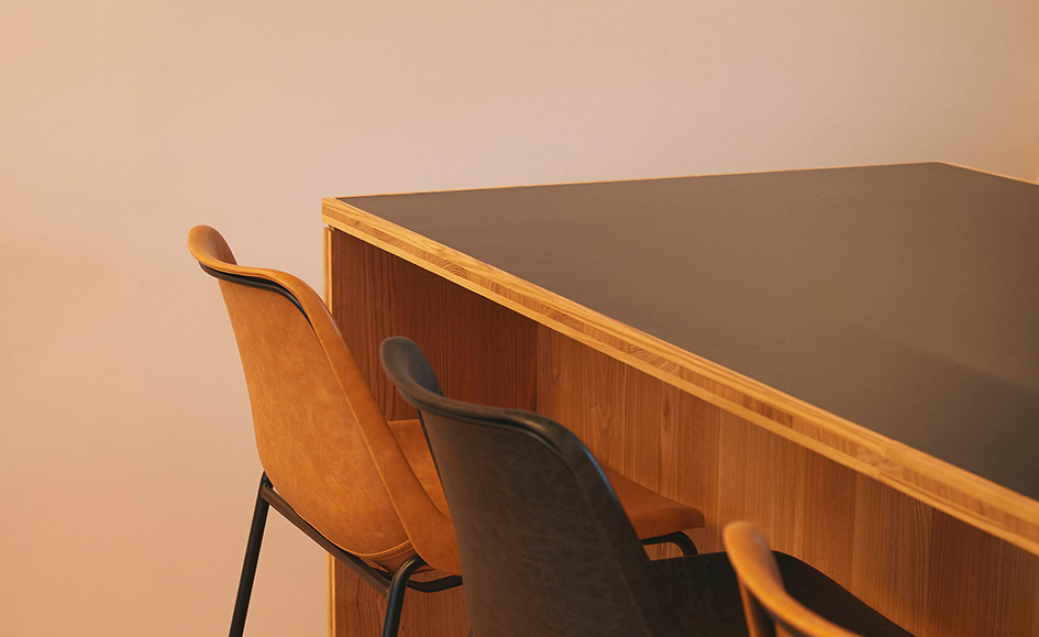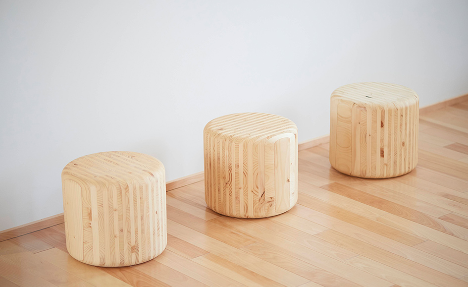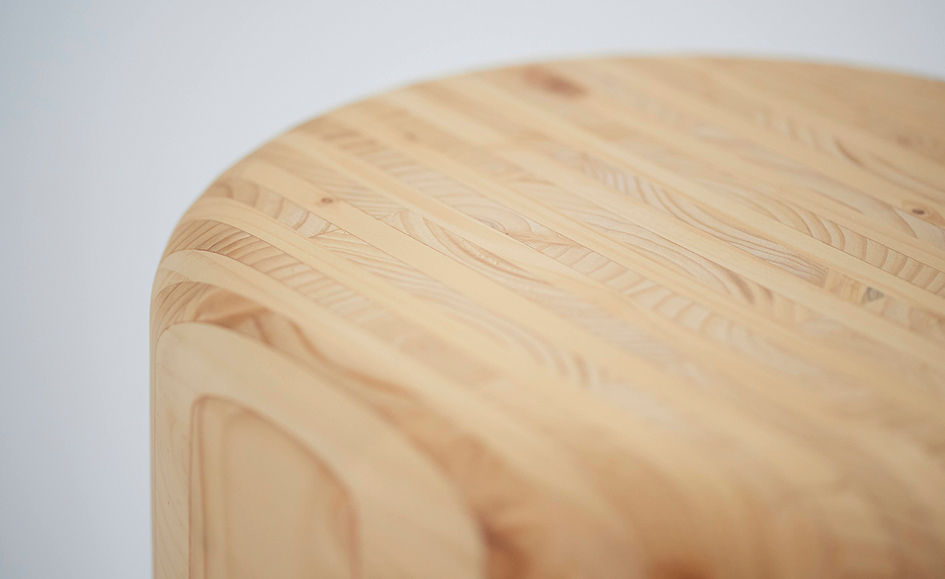 「ライナウッドは無垢と合板の中間のような、ちょうどいい素材なんです」そう語るのは、家具や生活道具の作家・デザイナーとして活動する荒木孝文さん。「無垢のような風合いを持ちつつ、積層させることで反りも抑えている。板厚もちょうどよくて加工がしやすく、削り直しもできるとても扱いやすい素材ですね」と、ご自身の創作活動を通しての実感を教えてくれました。「初めての経験だったのが、素材からインスピレーションを得るということ。小口を座面にしたスツールはその象徴的な作品で、ライナウッドの積層面を活かして強度を持たせつつ、その特徴的な層が魅力的な意匠になり、これまでにない形を生むことにもつながりました」と、荒木さん。「触っていて面白い新しい考えに出会える素材ですね」そう語ってくれました。