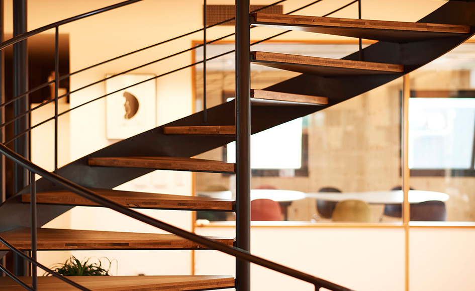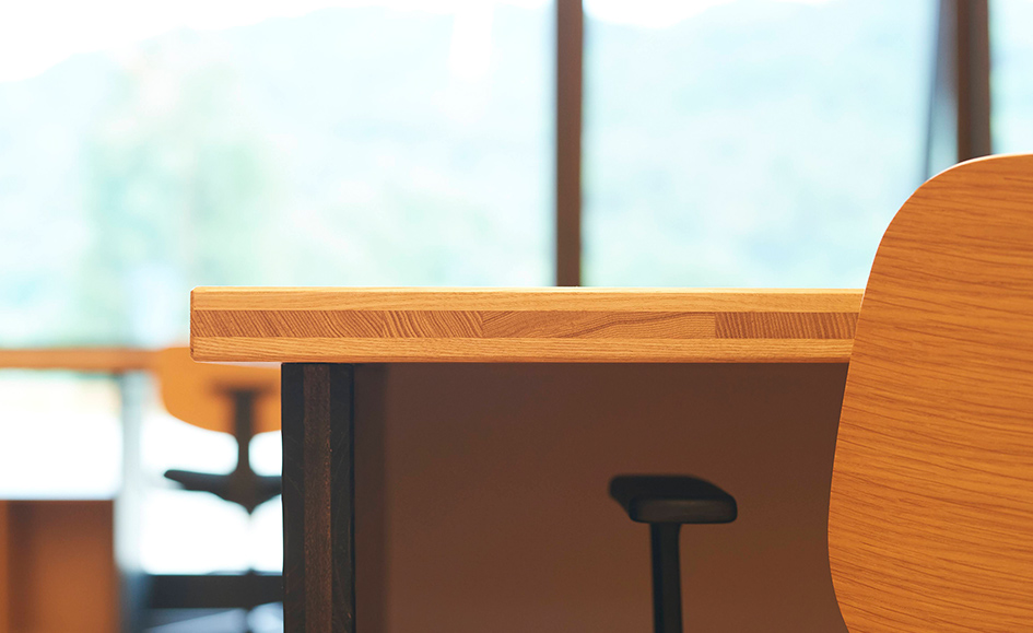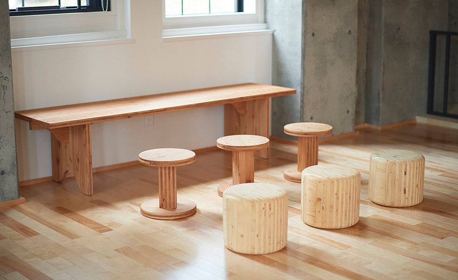 「社屋の家具デザインにライナウッドを使用しています。社屋のコンセプトは誰でも気軽に立ち寄れる場所」と語るのは、士別市で地域に根付く事業を展開しているイトイグループホールディングスの菅原さん。「環境負荷が小さく、デザイン性豊かなCLT工法を採用した社屋のデザインを進める中で、家具をどうしようかと考えていたときに、緑川木材さんの材を見つけました。ライナウッドは見た目には重さを感じさせないが、集合材などと違い、木本来の重さがズシッと来る。木口をカットしてそのまま使用できるので加工もしやすい。色を塗ったときに断面の塗装の見え方が違うので、映える。かわいいですよね」と新社屋の出来栄えを満足げに教えてくれました。「新しい社屋は、中も外もサステナブルで、リラックスできる空間にできたからなのか、まれに道の駅や美術館と間違えて会社に入ってくる人もいます」と笑って話す菅原さん。「そういうときは休憩所に案内してゆっくりしていってもらいますね。町内の人には敷地内にあるバスケットボールのコートで遊んでもらっています。誰もが気軽に遊んでいける社屋を目指しています」と語ってくれました。